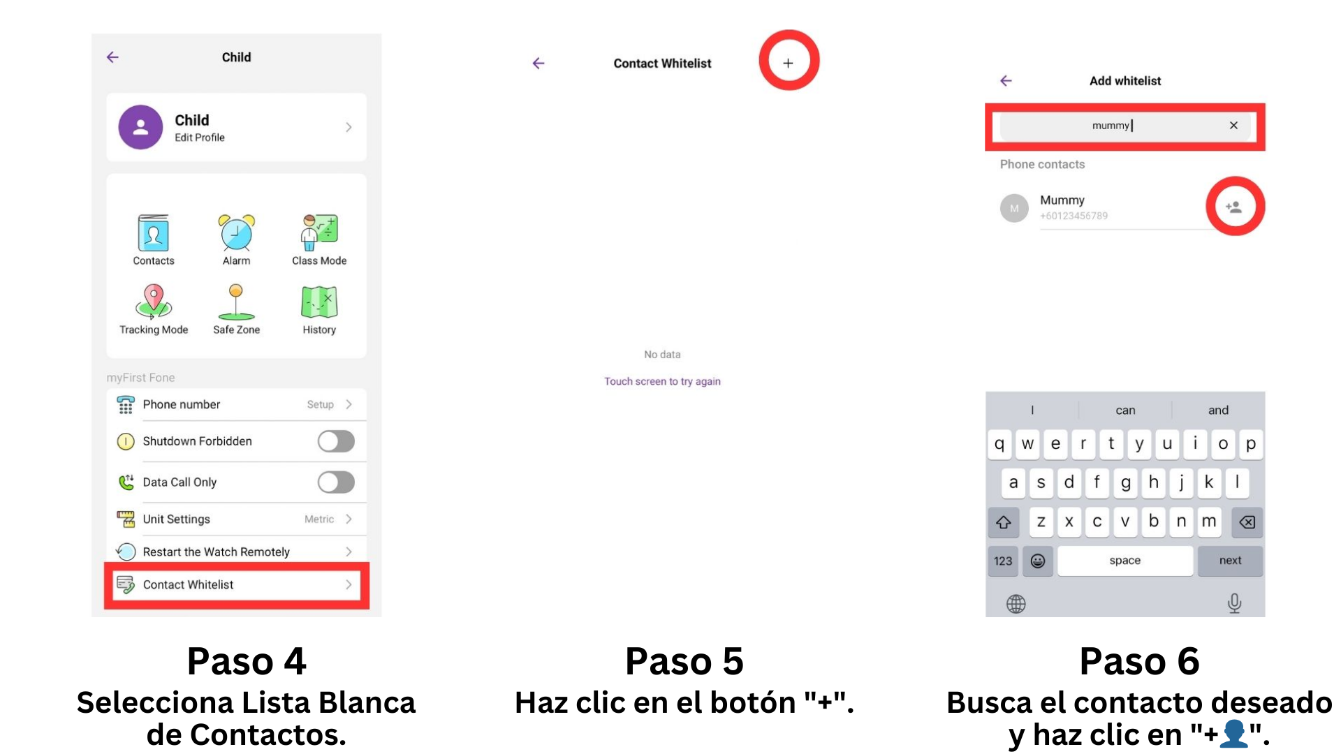 La función de Lista Blanca de Contactos en la aplicación myFirst Circle facilita la comunicación fluida entre individuos que no han instalado la aplicación Circle y el myFirst Fone. Al agregar un número de teléfono a la Lista Blanca, el reloj puede recibir llamadas directamente desde ese número de teléfono sin usar la aplicación, y el reloj también podrá llamar al número de teléfono directamente. Sin embargo, ten en cuenta que SOLO los modelos de SIM física que usan tarjetas SIM locales pueden llamar a números de teléfono sin usar la aplicación, ya que la tarjeta SIM de PCCW y la eSIM no tienen un número de teléfono.