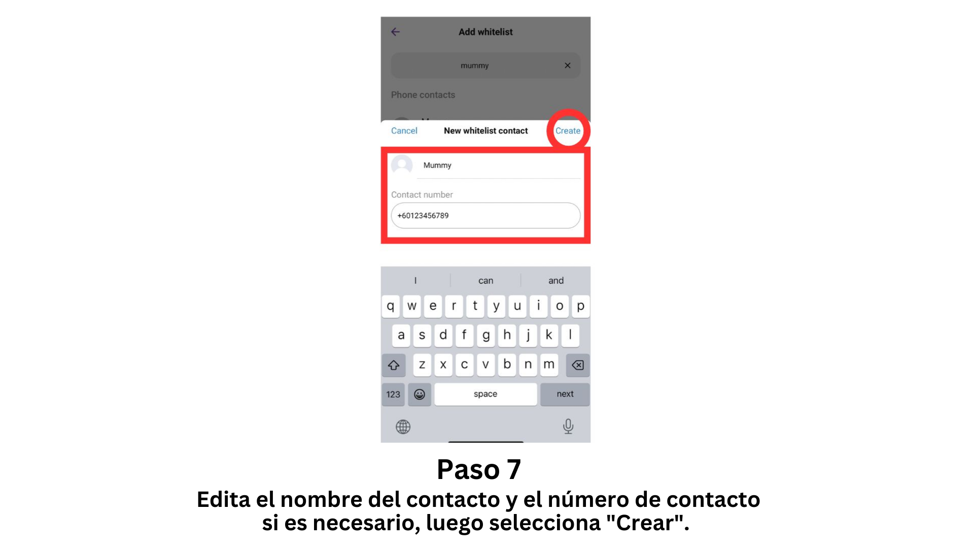 - Edita el nombre del contacto y el número de contacto si es necesario, luego selecciona "Crear".