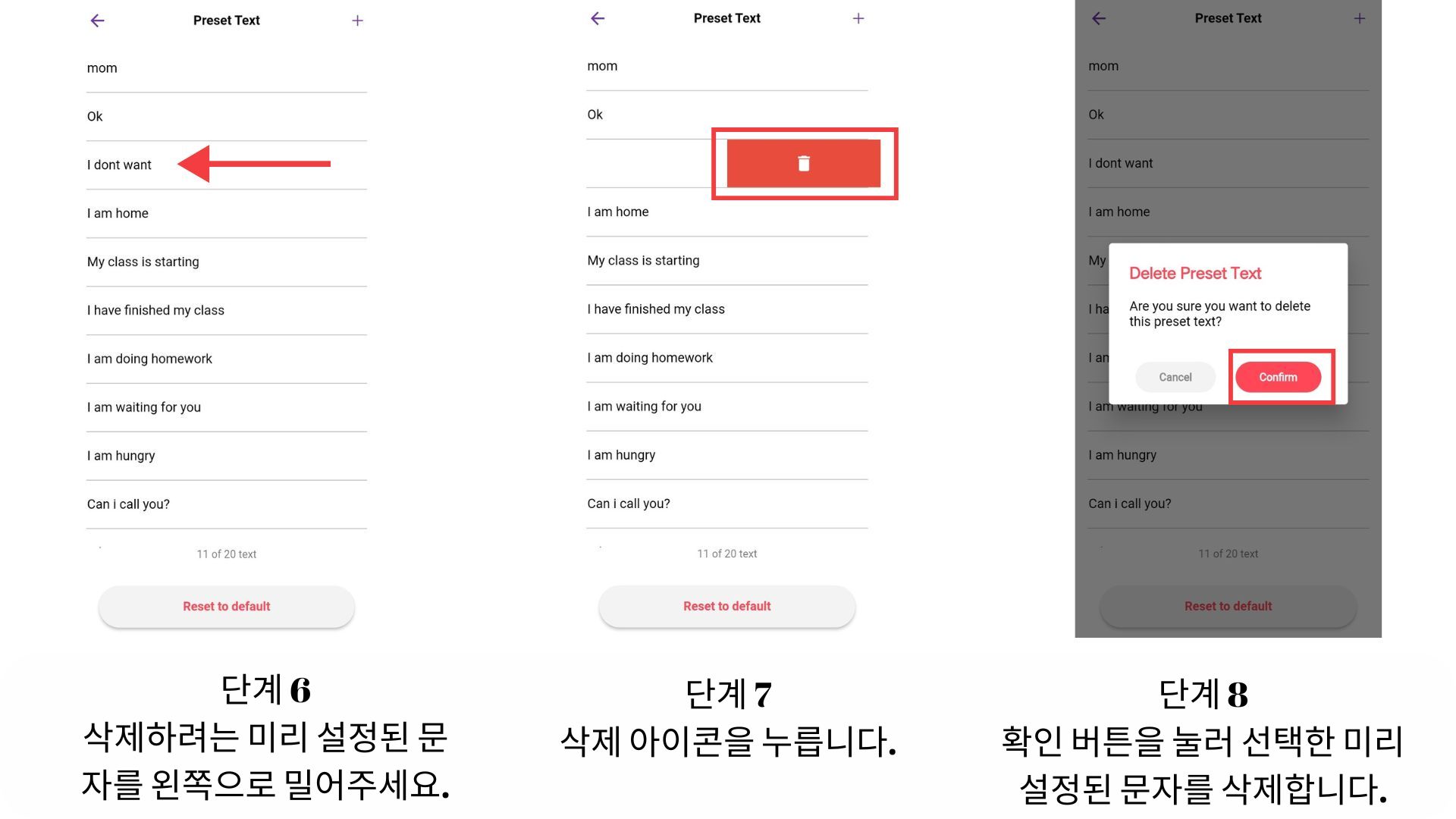 - 삭제하려는 미리 설정된 문자를 왼쪽으로 밀어주세요.