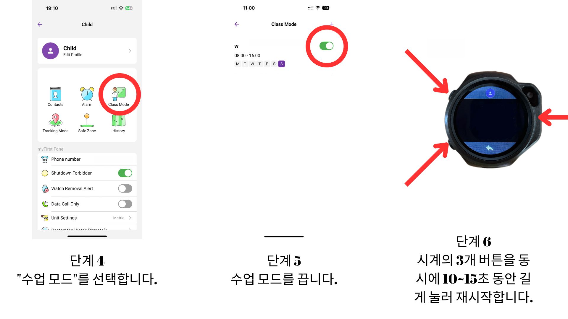 수업 모드를 끈 후에도 시계가 정상적으로 작동하지 않는다면, 모든 버튼을 동시에 10~15초 동안 길게 눌러 강제 재부팅을 시도해 주세요.