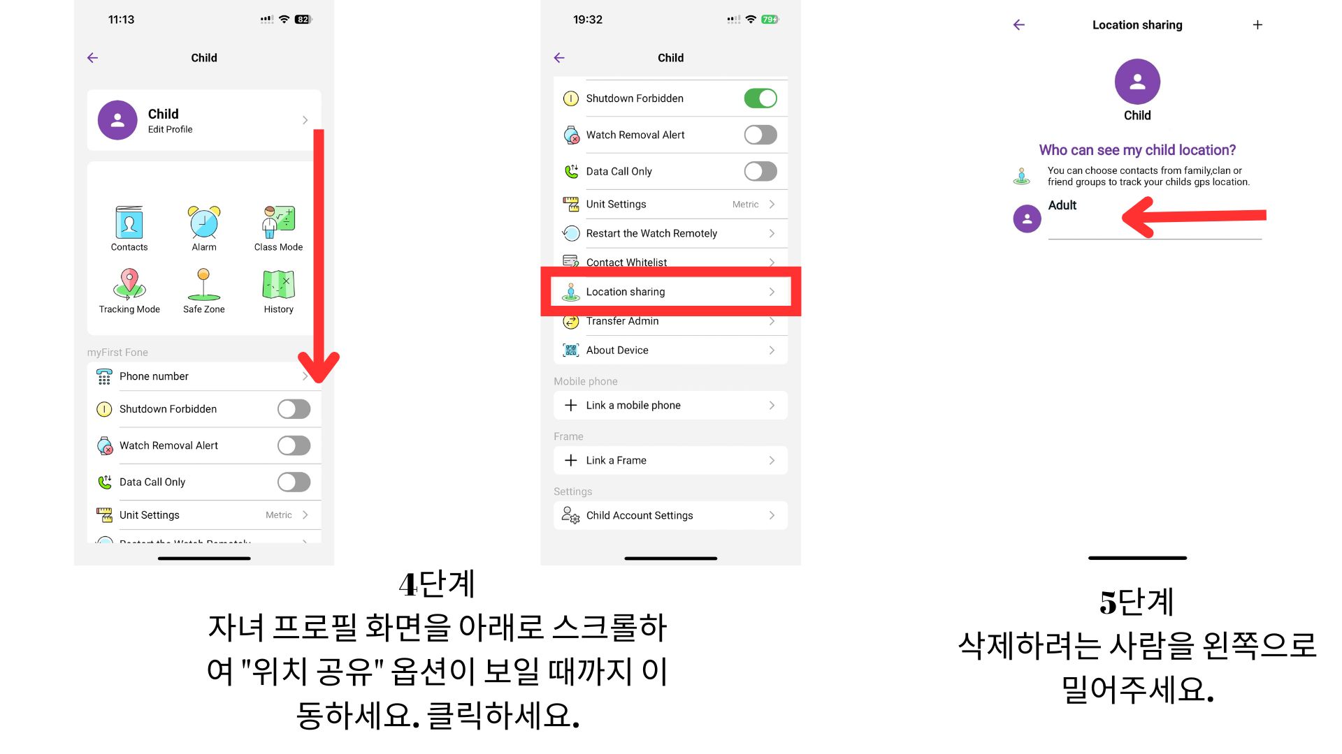 자녀의 myFirst Fone R1s 위치 공유를 다른 연락처에서 제거하는 방법