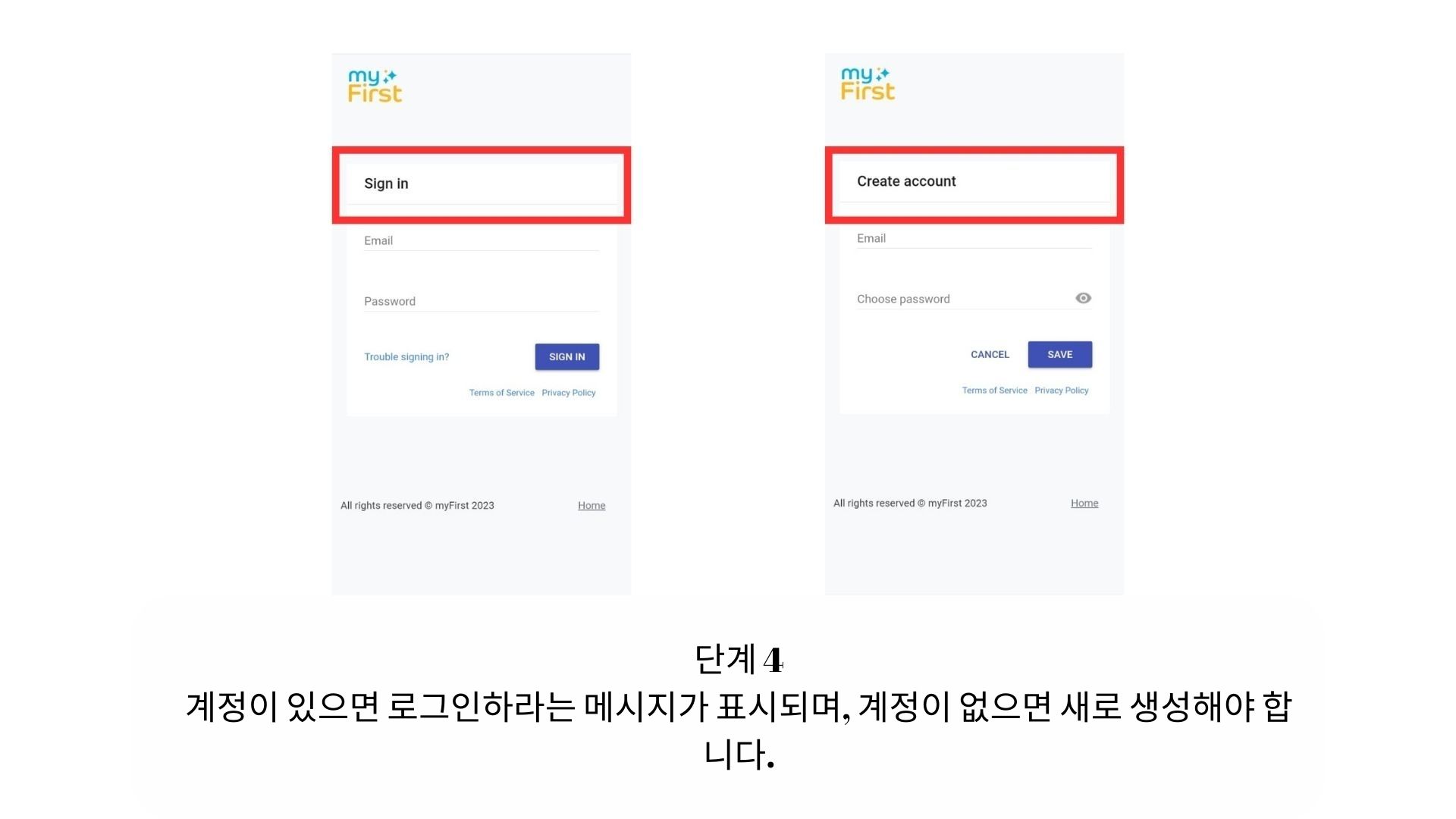 - 계정이 있으면 로그인 화면이 나타나고, 계정이 없으면 새 계정을 만들도록 안내됩니다.