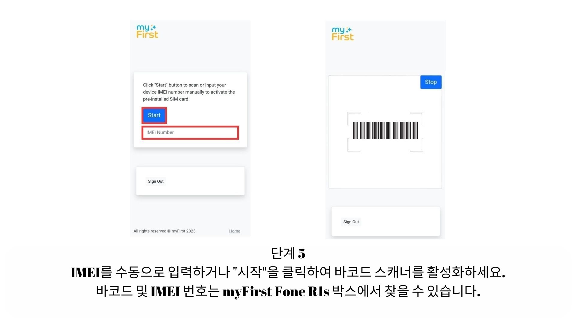 - 바코드 및 IMEI 번호는 myFirst Fone R1s 박스에서 확인할 수 있습니다.