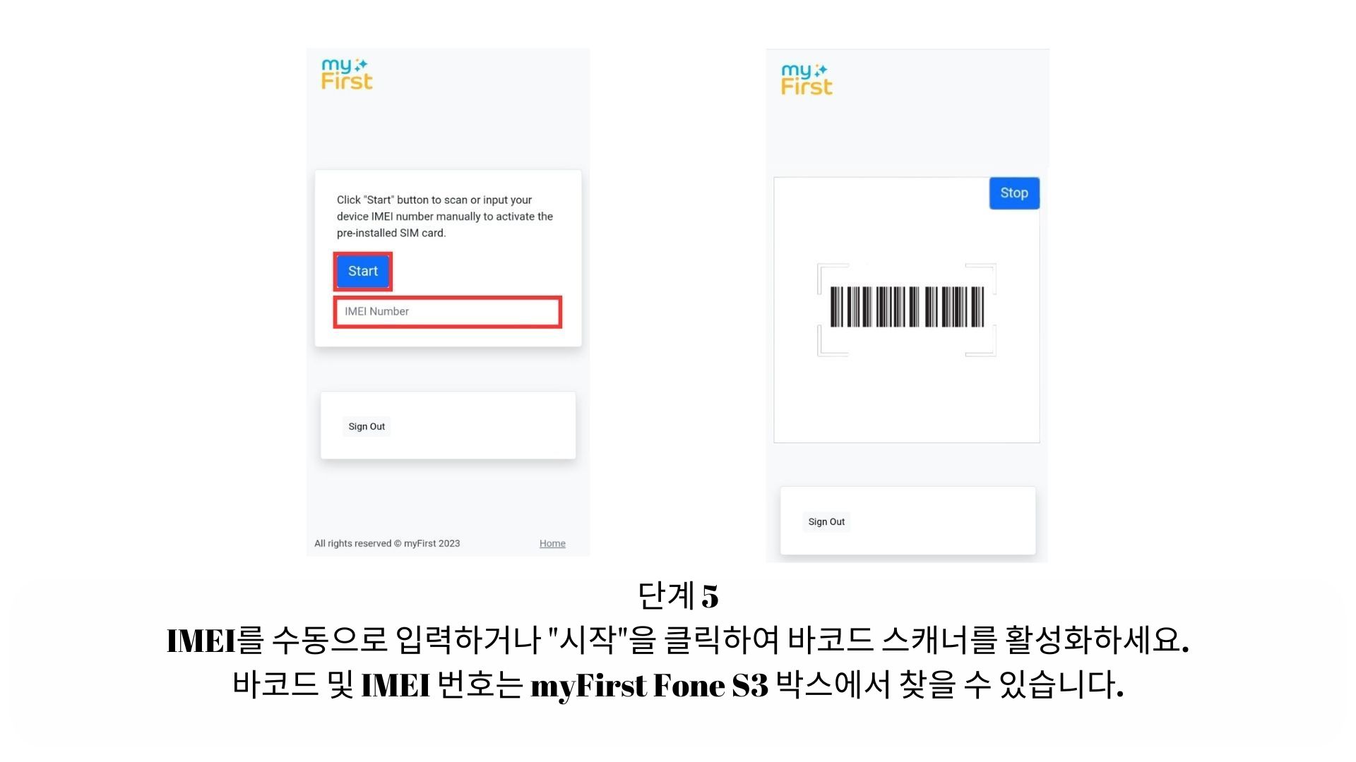 - 바코드 및 IMEI 번호는 myFirst Fone S3 박스에서 확인할 수 있습니다.