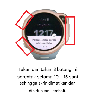 Jika jam masih mengalami masalah walaupun Mod Kelas telah dimatikan melalui aplikasi myFirst Circle, cuba mulakan semula jam dengan menekan dan menahan semua butang serentak selama kira-kira 10–15 saat.