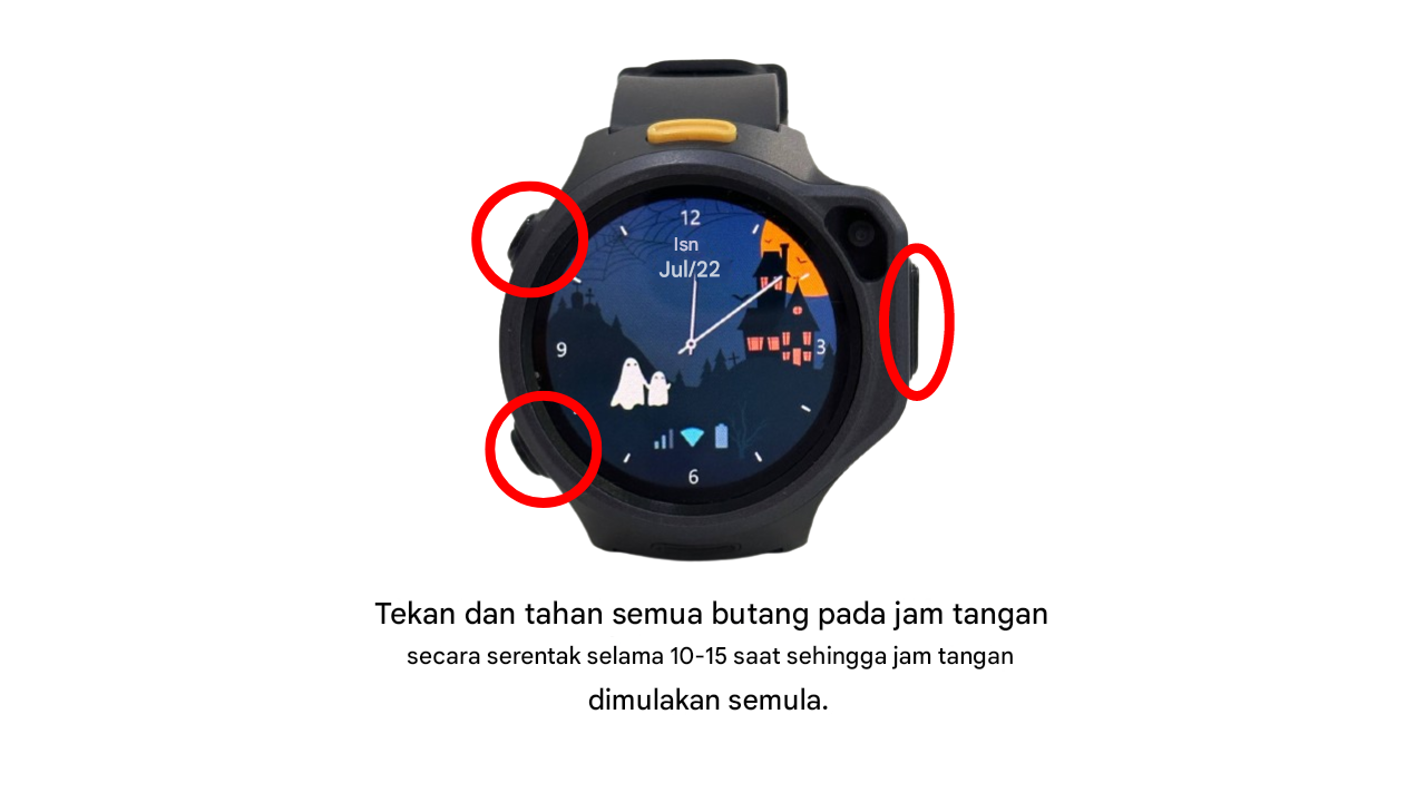 - Tekan dan tahan semua butang pada jam tangan secara serentak selama 10-15 saat sehingga jam tangan dimulakan semula.