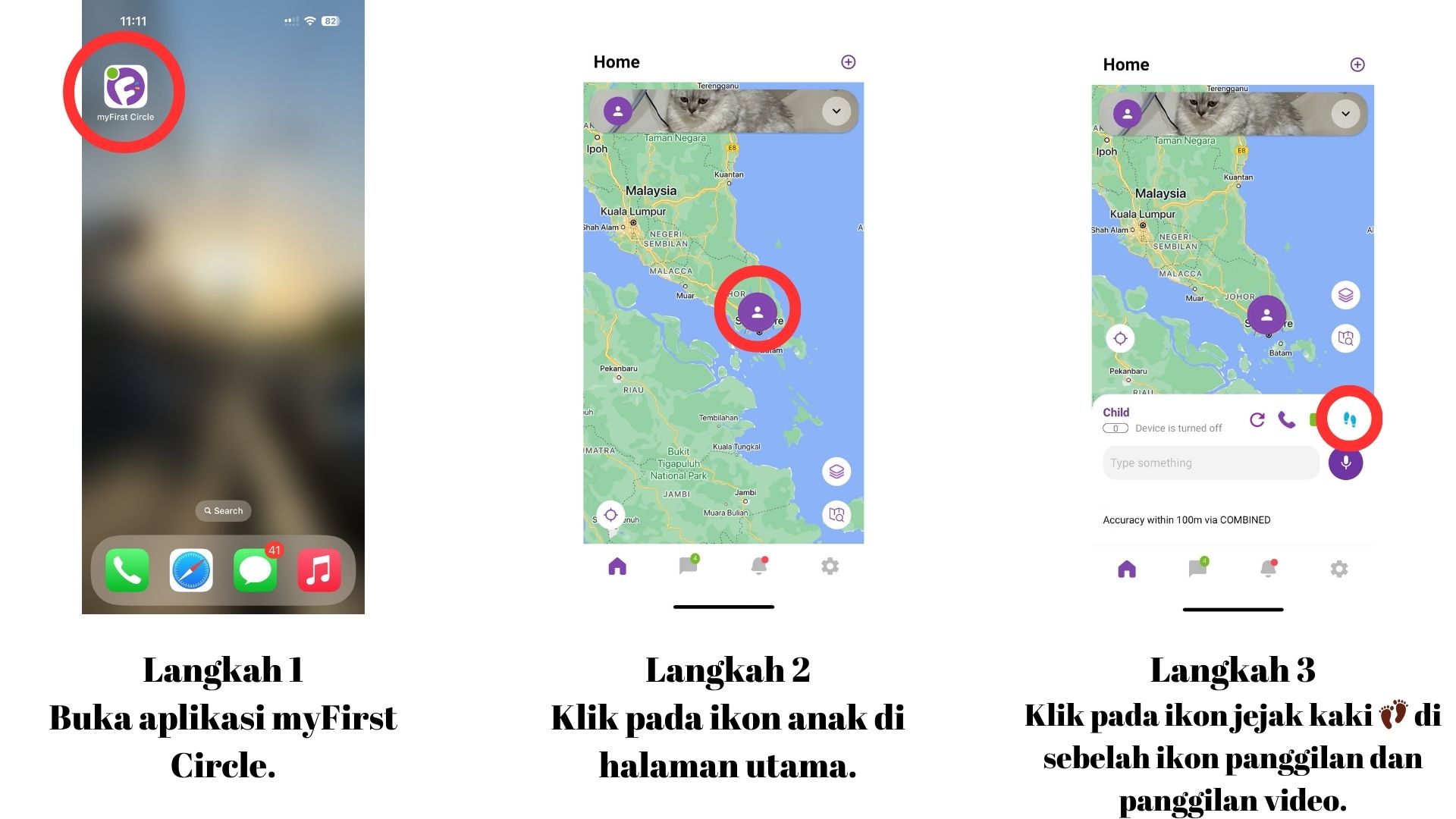 Anda boleh melihat jumlah langkah yang dikumpulkan melalui aplikasi myFirst Circle di telefon ibu bapa. Setelah sasaran harian dicapai, jam akan memaparkan mesej "GOAL~" bersama jumlah langkah yang diambil serta tahap pencapaian.