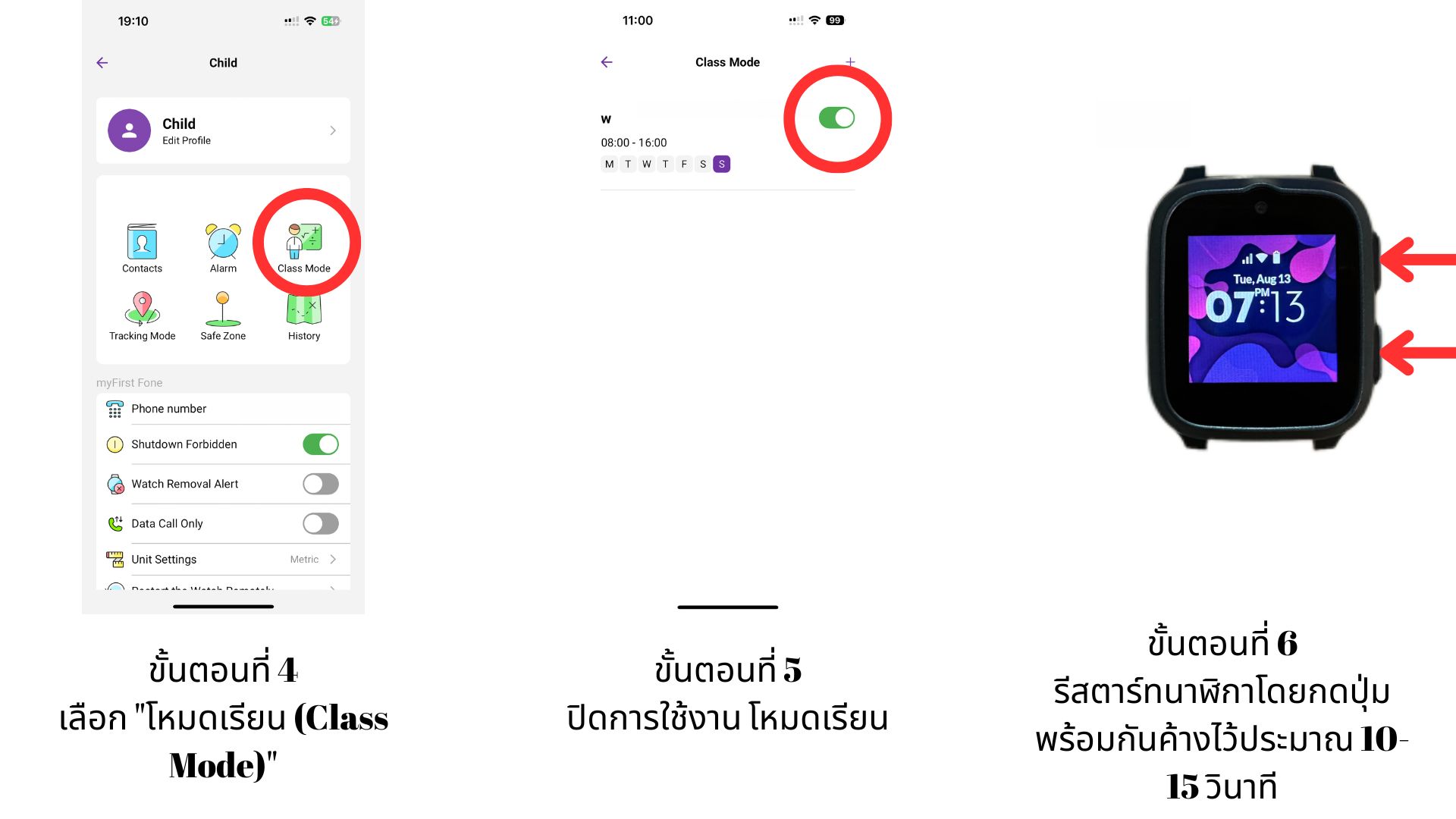 ฟังก์ชันทั้งหมดจะถูกปิดใช้งาน ยกเว้น การโทรฉุกเฉิน SOS ซึ่งจะยังคงเปิดใช้งานอยู่ เมื่อตั้งค่าแจ้งเตือน SOS อุปกรณ์จะส่งข้อความเสียงความยาว 30 วินาทีพร้อมตำแหน่งปัจจุบันของเด็กไปยังผู้ปกครองผ่านแอป myFirst Circle