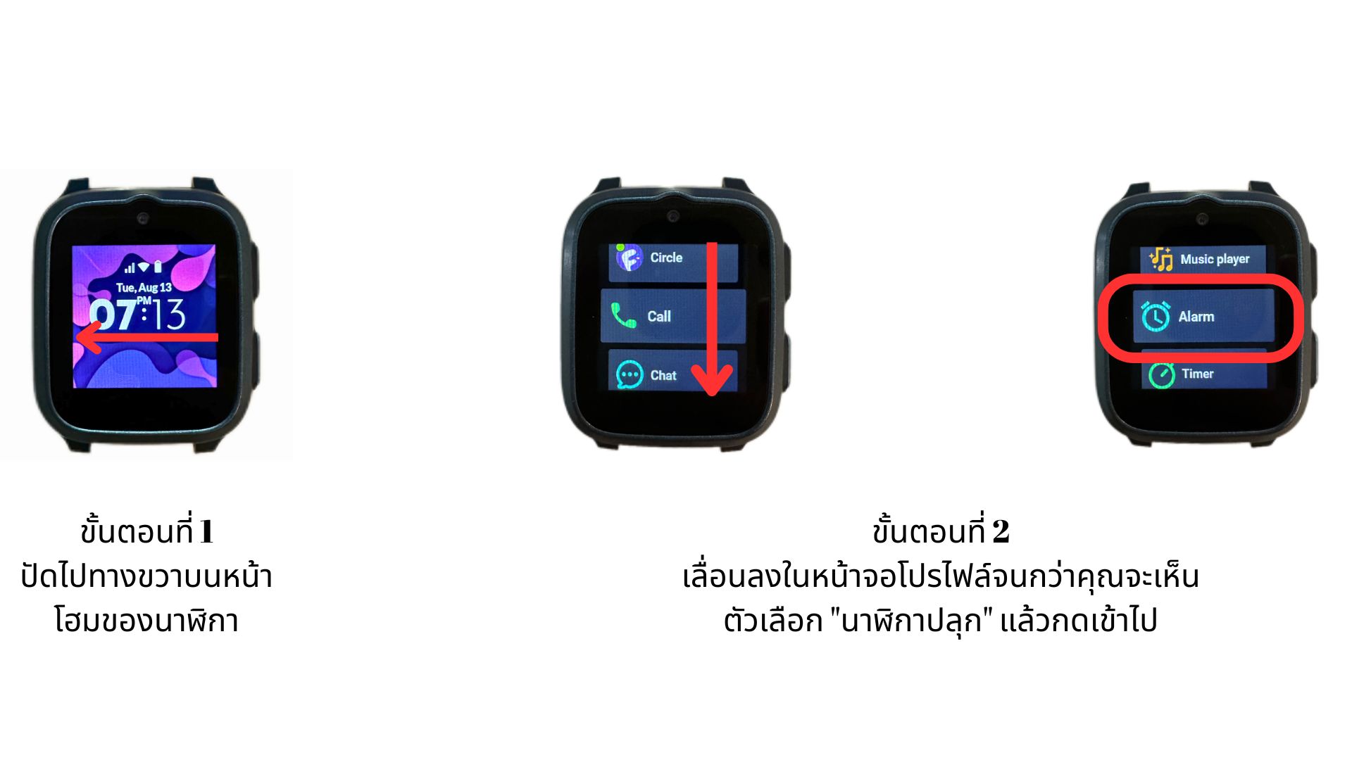 - ปัดไปทางขวาบนหน้าโฮมของนาฬิกา