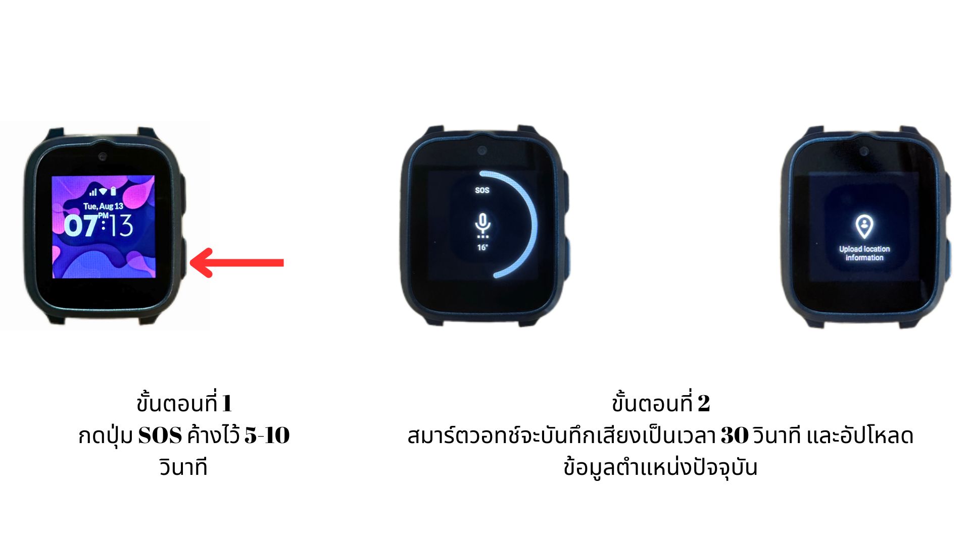 - สมาร์ตวอทช์จะบันทึกเสียงเป็นเวลา 30 วินาที และอัปโหลดข้อมูลตำแหน่งปัจจุบัน