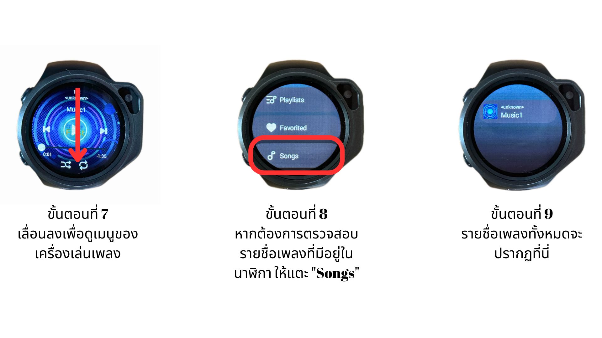 หากต้องการตรวจสอบรายชื่อเพลงที่มีอยู่ในนาฬิกา ให้แตะ "Songs"