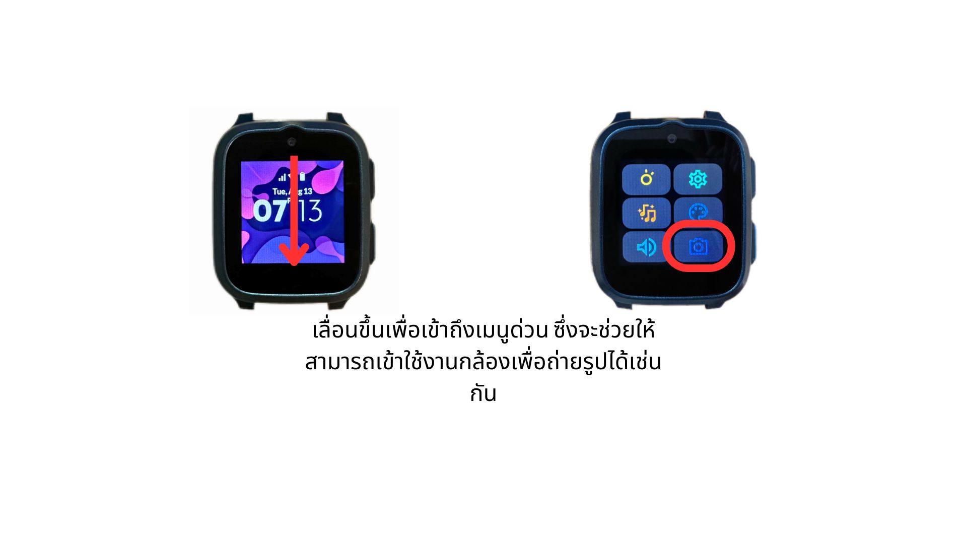 - เลื่อนขึ้นเพื่อเข้าถึงเมนูด่วน ซึ่งจะช่วยให้สามารถเข้าใช้งานกล้องเพื่อถ่ายรูปได้เช่นกัน