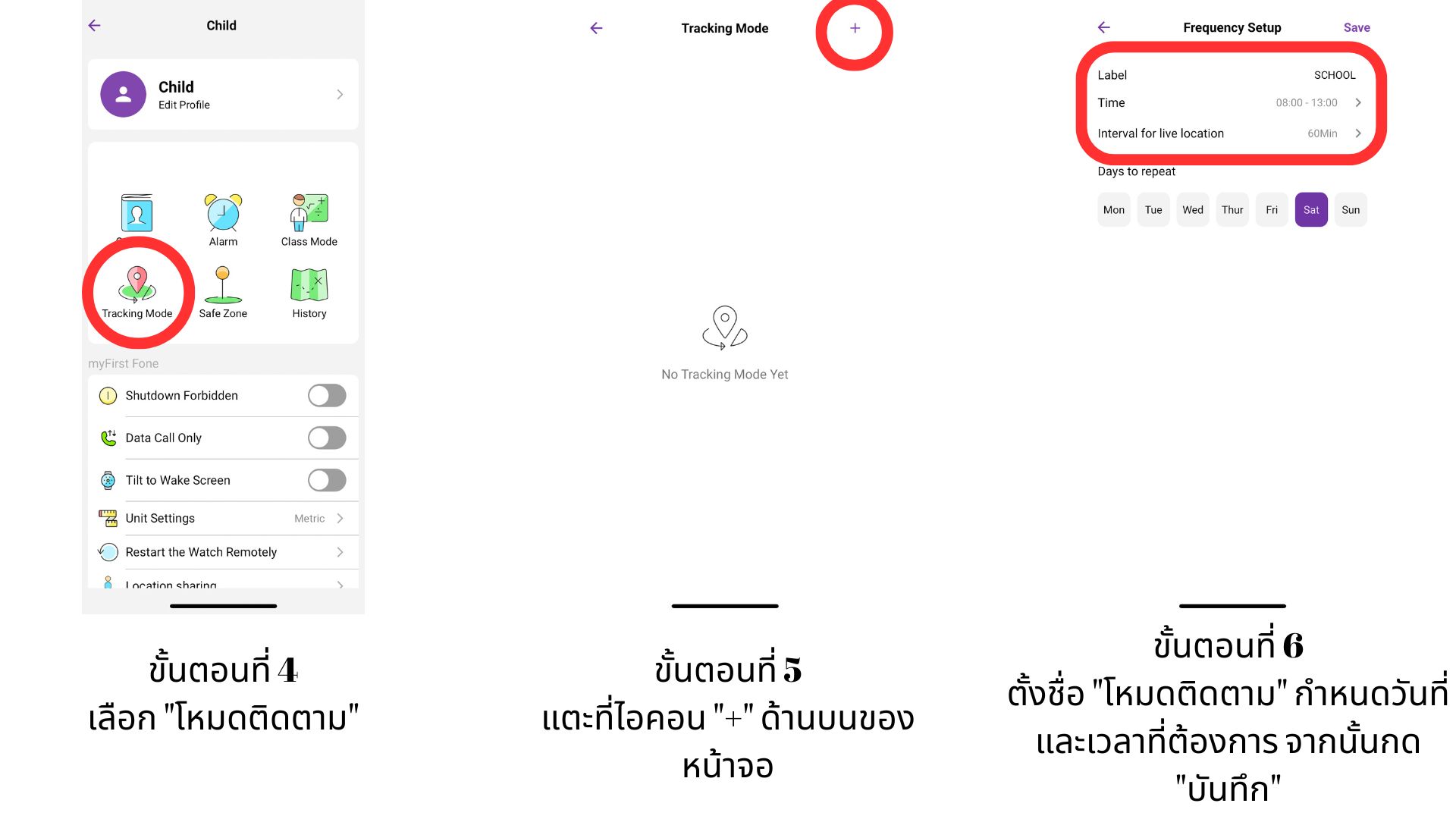 ฟังก์ชัน "โหมดติดตาม" ในแอป myFirst Circle ช่วยให้คุณได้รับการอัปเดตตำแหน่งของบุตรหลานเป็นระยะ ๆ