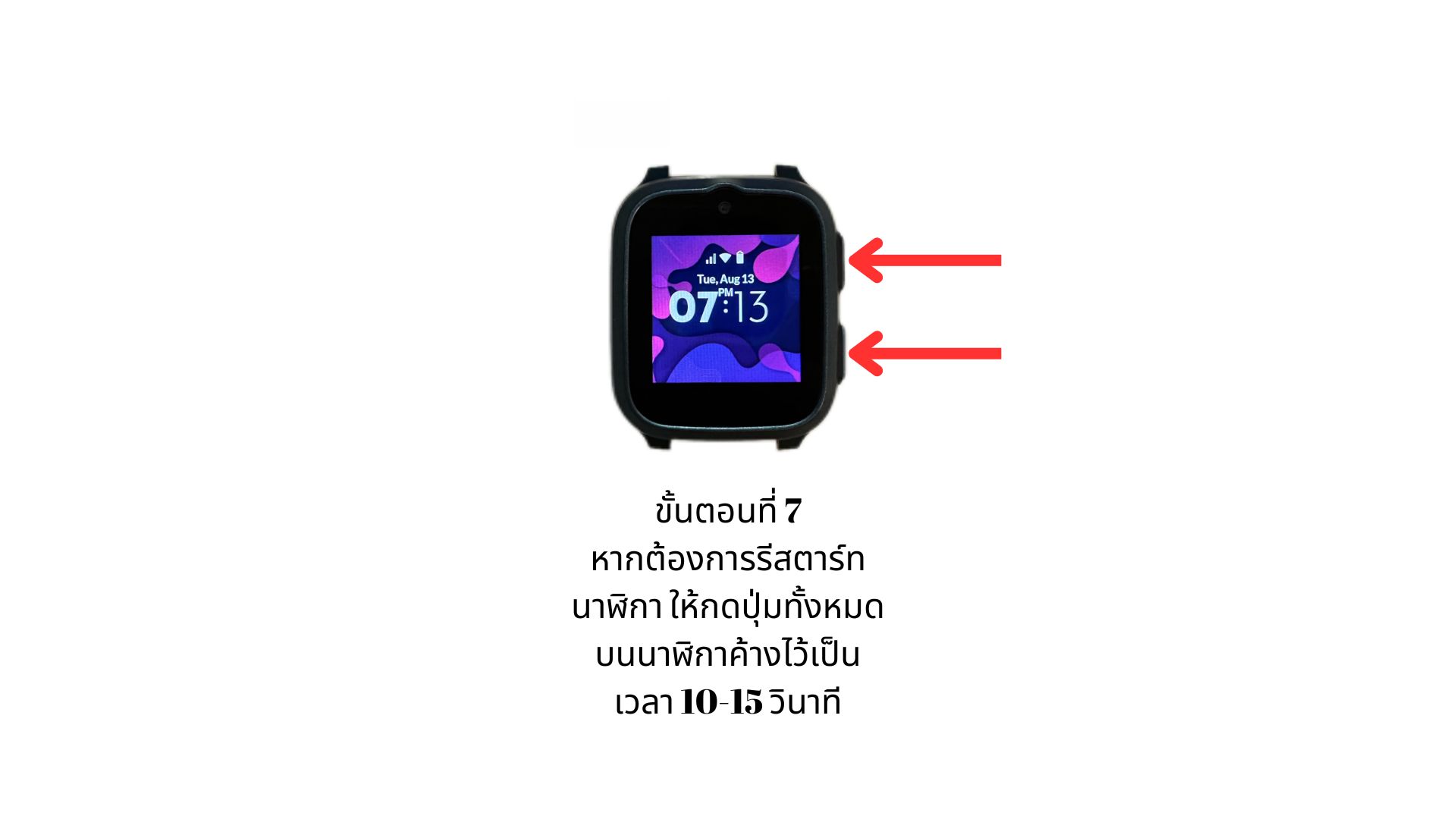 - หากต้องการรีสตาร์ทนาฬิกา ให้กดปุ่มทั้งหมดบนนาฬิกาค้างไว้เป็นเวลา 10-15 วินาที