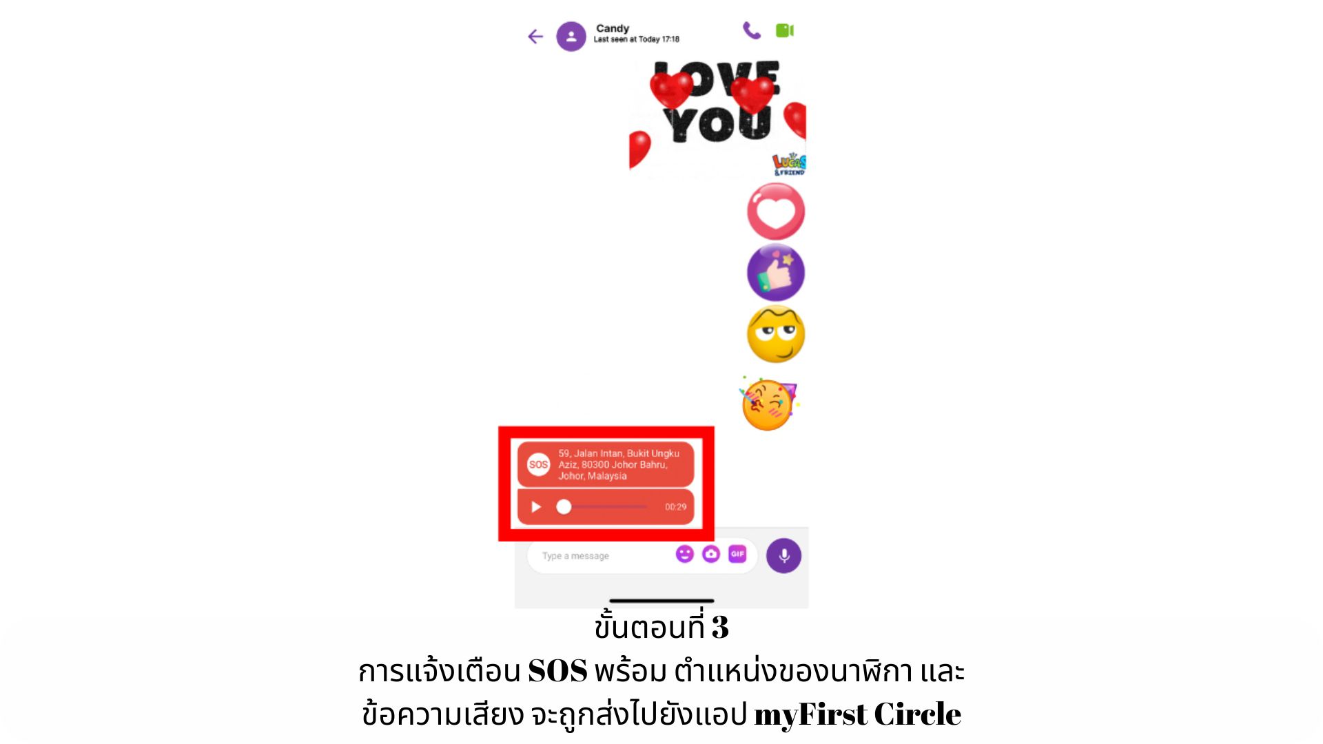 เมื่อมีการเปิดใช้งานการแจ้งเตือน SOS นาฬิกาจะส่ง ข้อความเสียง 30 วินาที พร้อมกับ ตำแหน่งปัจจุบันของเด็ก ไปยังผู้ปกครองผ่านแอป myFirst Circle ผู้ปกครองสามารถฟังข้อความเสียง ทำความเข้าใจกับสถานการณ์ และดำเนินการตามความเหมาะสมเพื่อให้แน่ใจว่าเด็กปลอดภัย