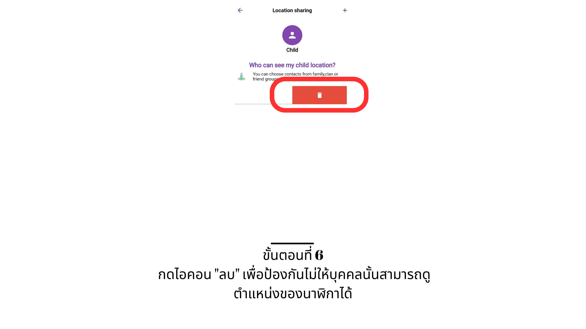 - เลื่อนลงมาที่หน้าข้อมูลโปรไฟล์ของลูก จนกว่าจะเห็นตัวเลือก "การแชร์ตำแหน่ง" แล้วกดเลือก