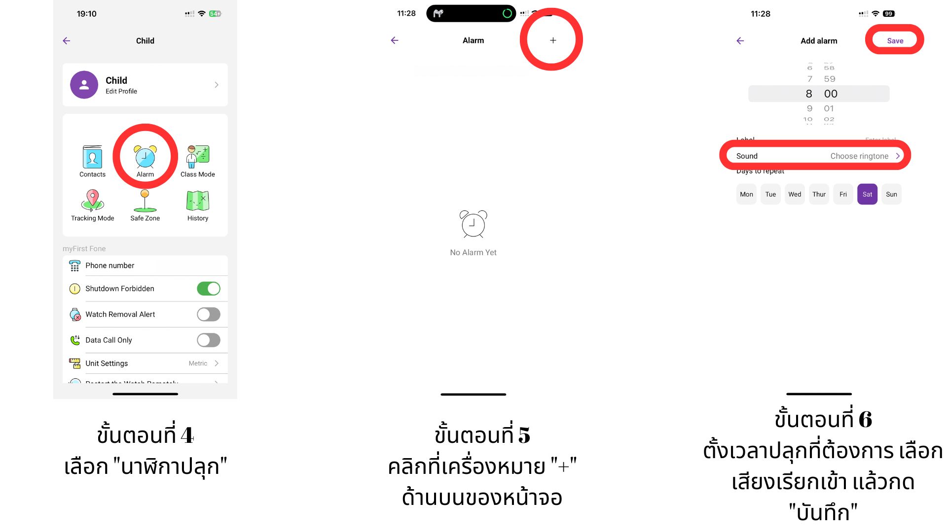 คุณสามารถตั้งนาฬิกาปลุกได้โดยเข้าแอป myFirst Circle และเลือกตัวเลือก นาฬิกาปลุก จากนั้นตั้งเวลาได้ตามที่ต้องการ