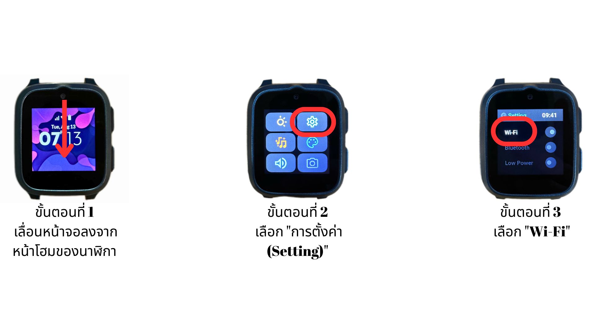 หากต้องการเชื่อมต่อนาฬิกาของคุณกับเครือข่ายไร้สายหรือ Bluetooth (BT) ให้เลือก "การตั้งค่า (Settings)" บนนาฬิกา แล้วแตะที่ "การเชื่อมต่อไร้สาย (Wireless Connection)" ระบบจะเชื่อมต่อกับอุปกรณ์โดยอัตโนมัติ