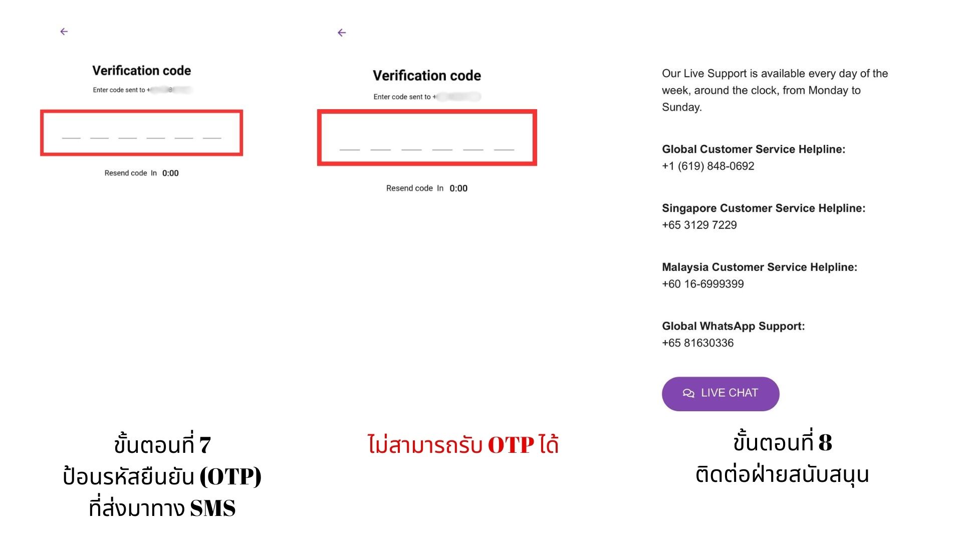 หากคุณไม่ได้รับ OTP โปรดติดต่อฝ่ายสนับสนุน (ลิงก์) พร้อมให้ข้อมูลต่อไปนี้: