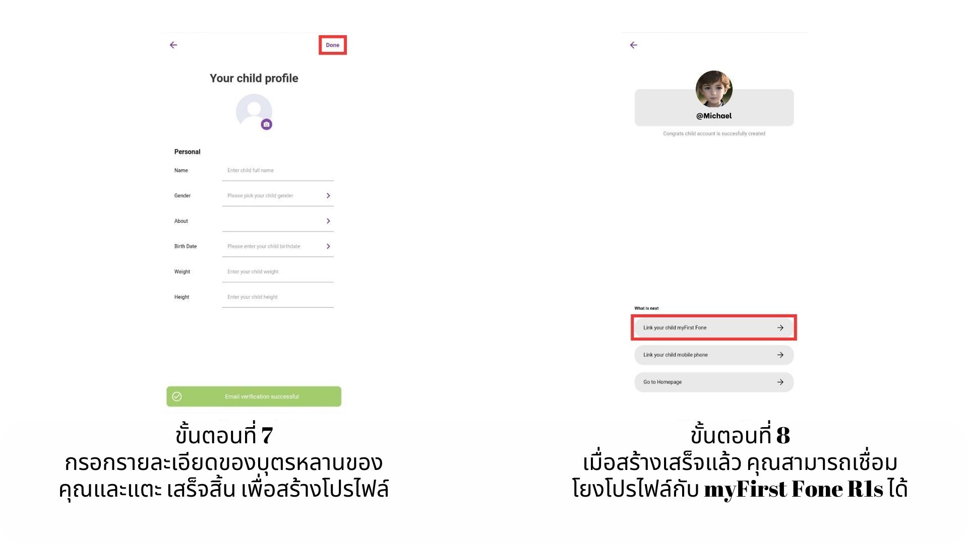 - เมื่อสร้างเสร็จแล้ว คุณสามารถเชื่อมโยงโปรไฟล์กับ myFirst Fone R1s ได้