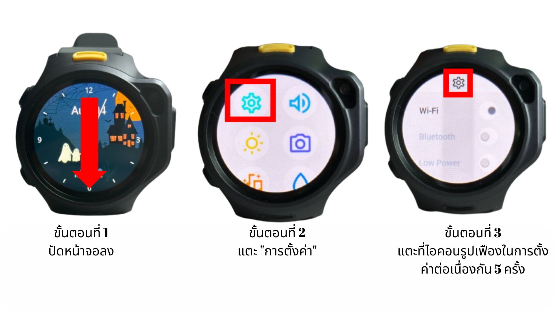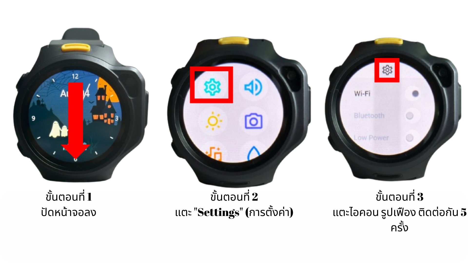 - แตะ ไอคอนเฟืองการตั้งค่า ติดต่อกัน 5 ครั้ง