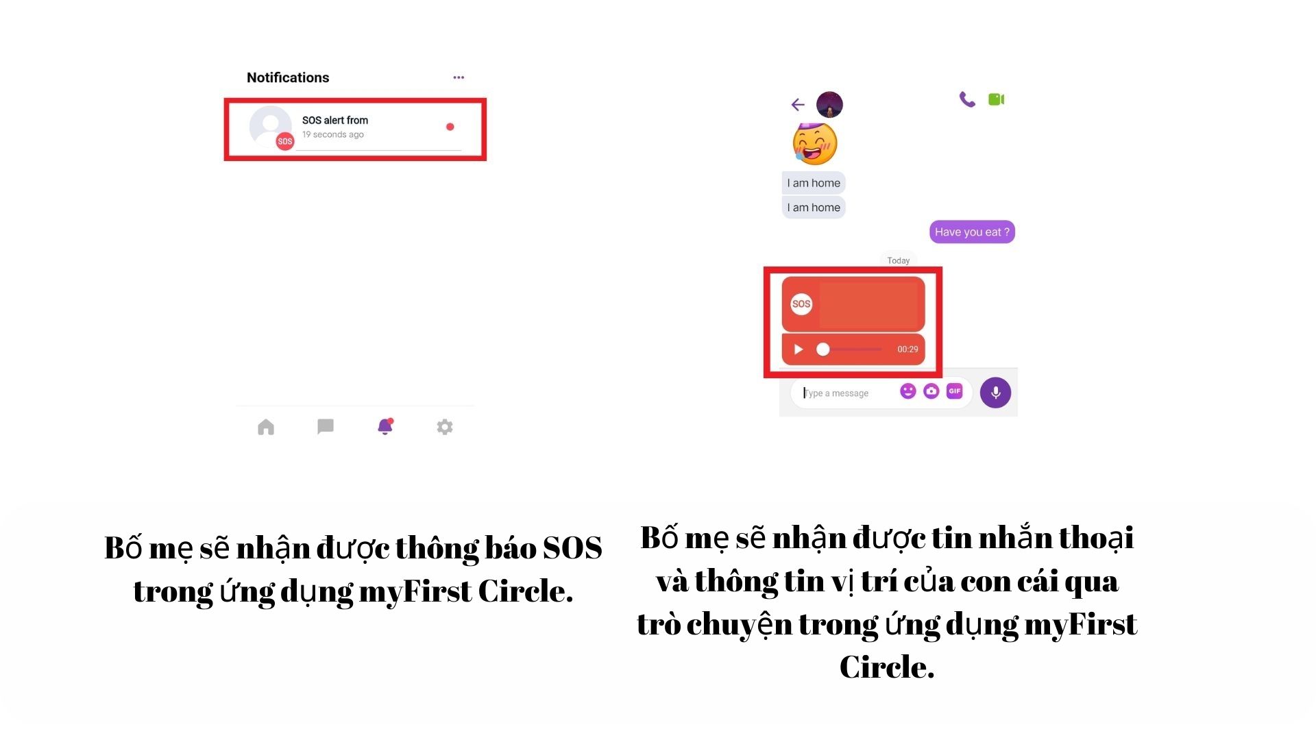 Khi cảnh báo SOS được kích hoạt, thiết bị sẽ gửi tin nhắn thoại dài 30 giây cùng với vị trí hiện tại của trẻ đến phụ huynh thông qua ứng dụng myFirst Circle. Phụ huynh sau đó có thể nghe tin nhắn thoại, hiểu tình huống và thực hiện các zhành động cần thiết để đảm bảo an toàn cho trẻ.
