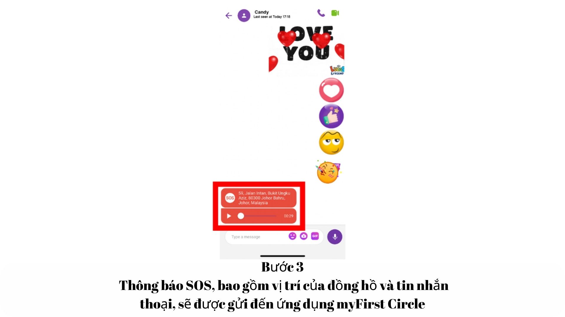 Khi cảnh báo SOS được kích hoạt, thiết bị sẽ gửi một tin nhắn thoại dài 30 giây cùng với vị trí hiện tại của trẻ đến cha mẹ thông qua ứng dụng myFirst Circle. Cha mẹ có thể nghe tin nhắn thoại, hiểu tình huống và thực hiện các hành động cần thiết để đảm bảo an toàn cho trẻ.